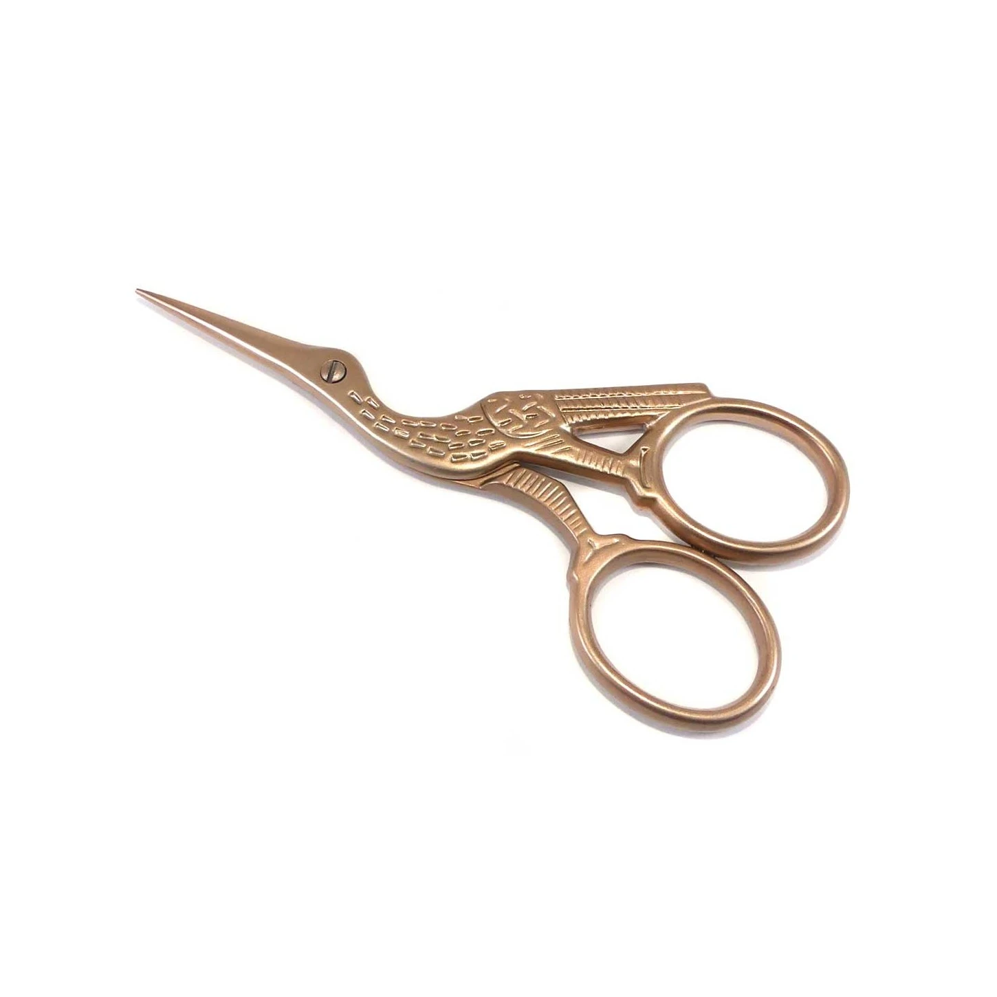 Tijera con diseño clásico en forma de cigüeña, de acero inoxidable y bañado en oro rosa mate.