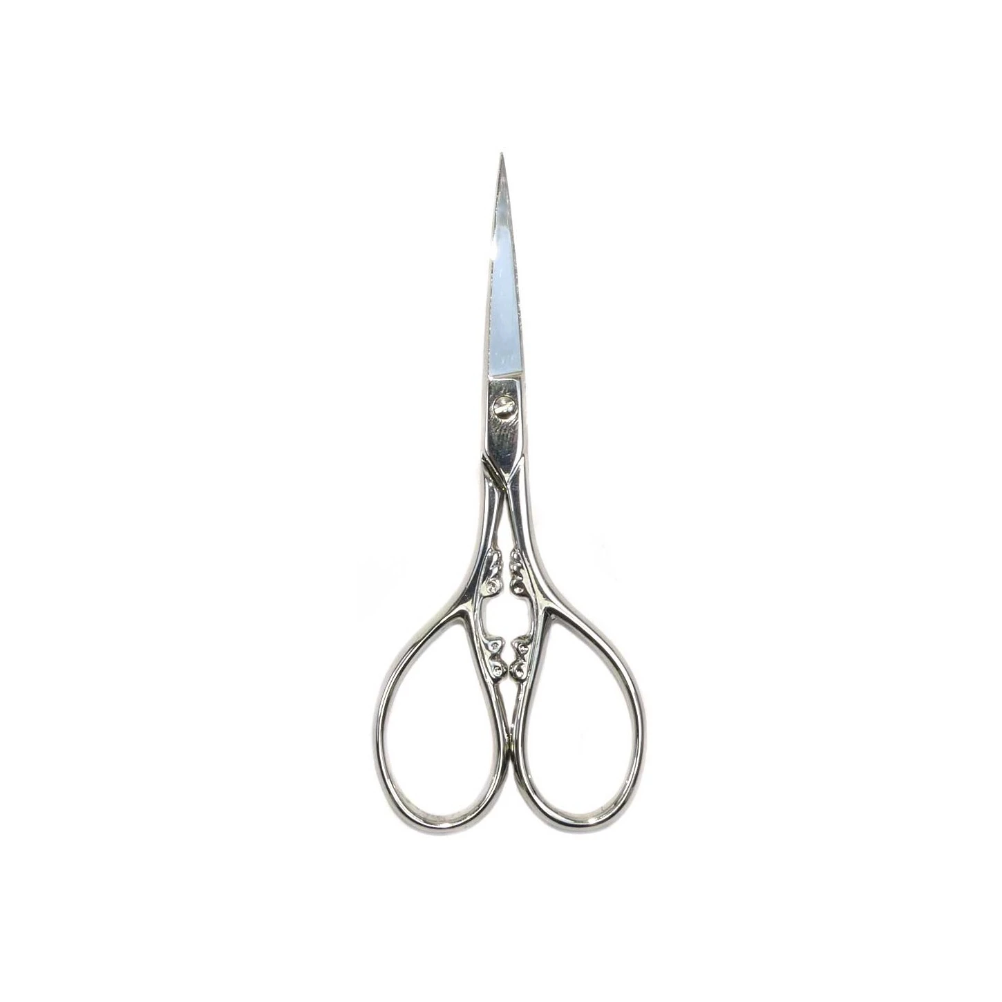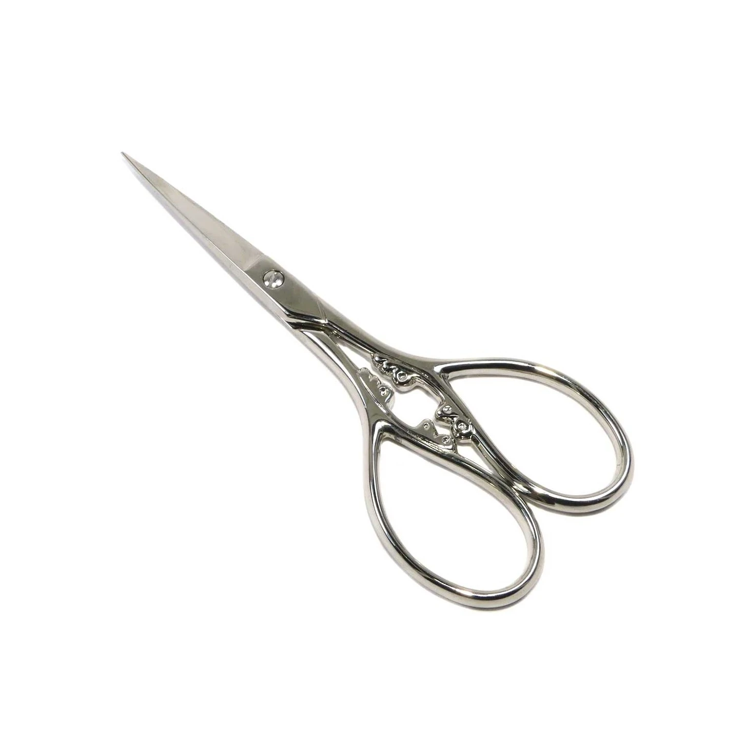 Tijera con diseño clásico decorativo en plata, de acero inoxidable.
