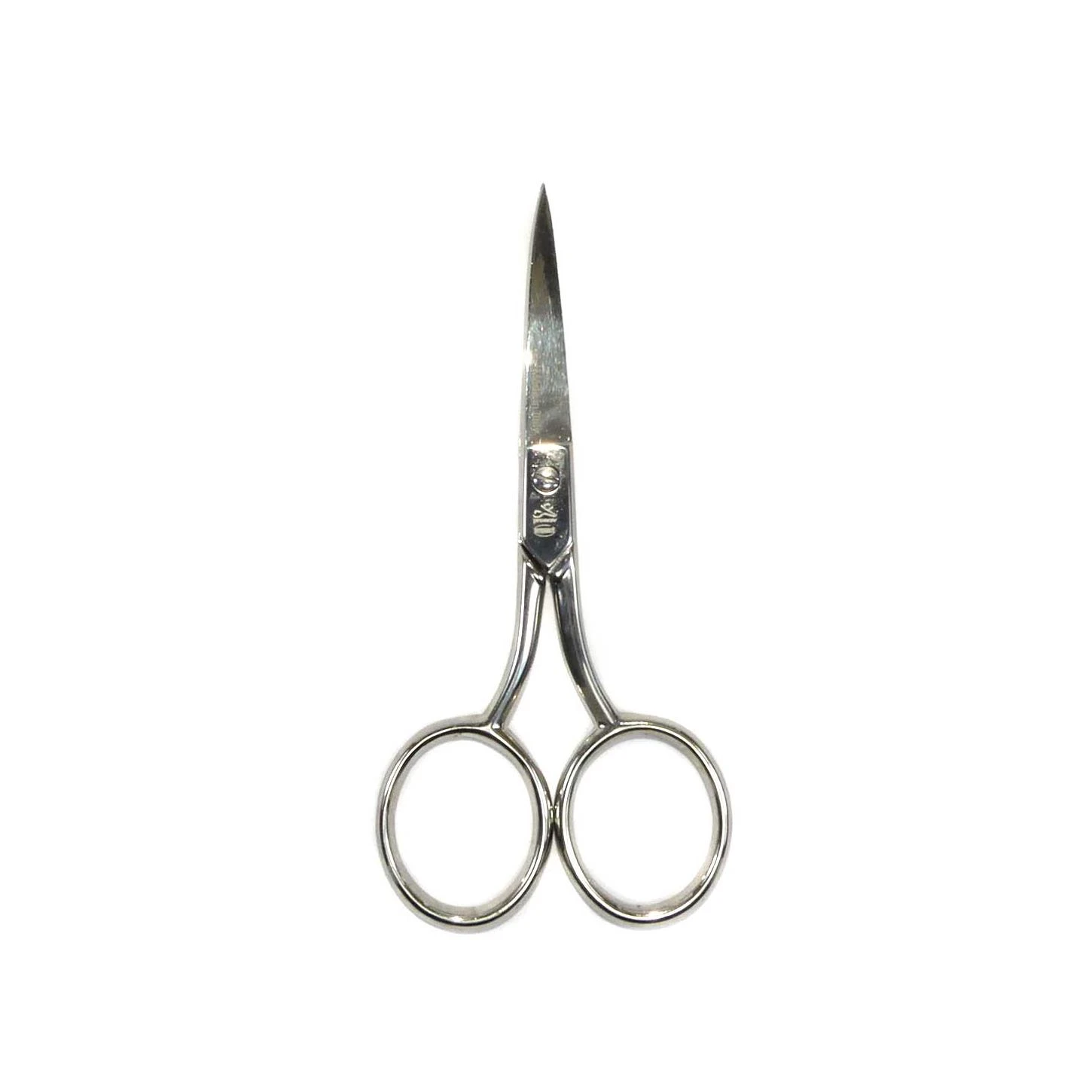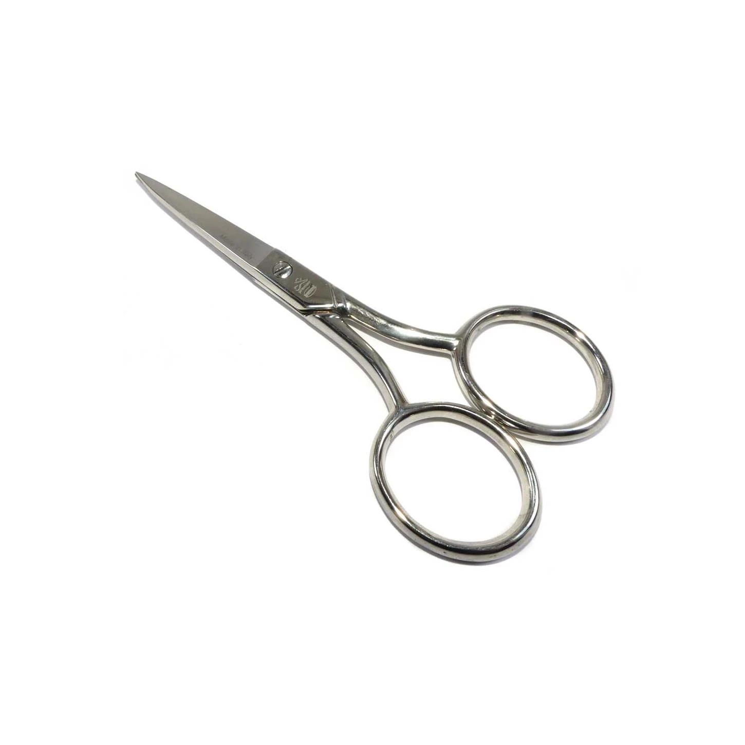 Tijera para bordar y realizar labores, de acero inoxidable en color plata con diseño recto y agujeros para los dedos grandes. De 11,5cm de longitud.