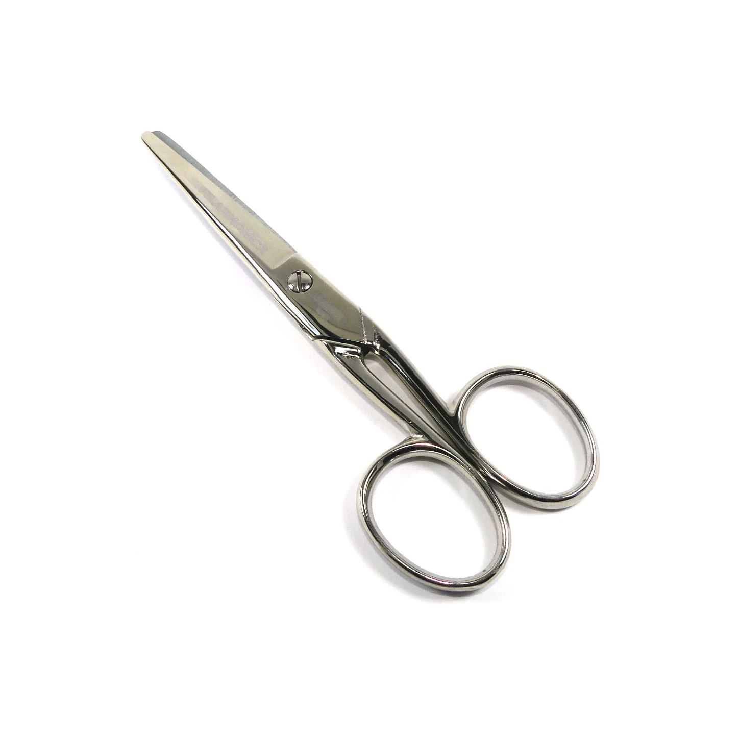 Tijera de acero inoxidable de 12,5cm de longitud, con punta roma o redondeada y muy adaptable a la forma de la mano, con corte limpio.