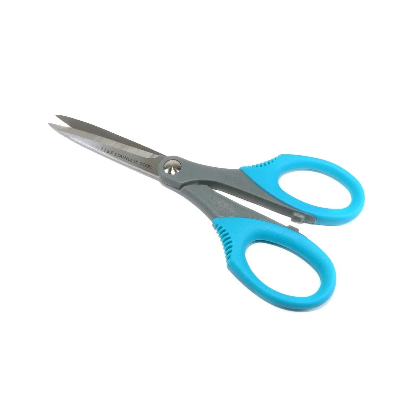 Tijeras para costura, con punta recta afilada y mango ergonómico azul. De 16,5cm de longitud.