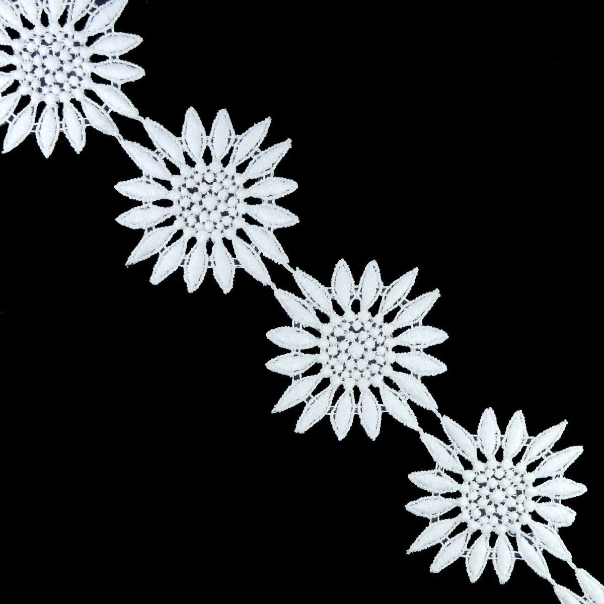 Flores en guipur con forma de girasoles en color blanco. El diámetro de cada flor es de 5cm.