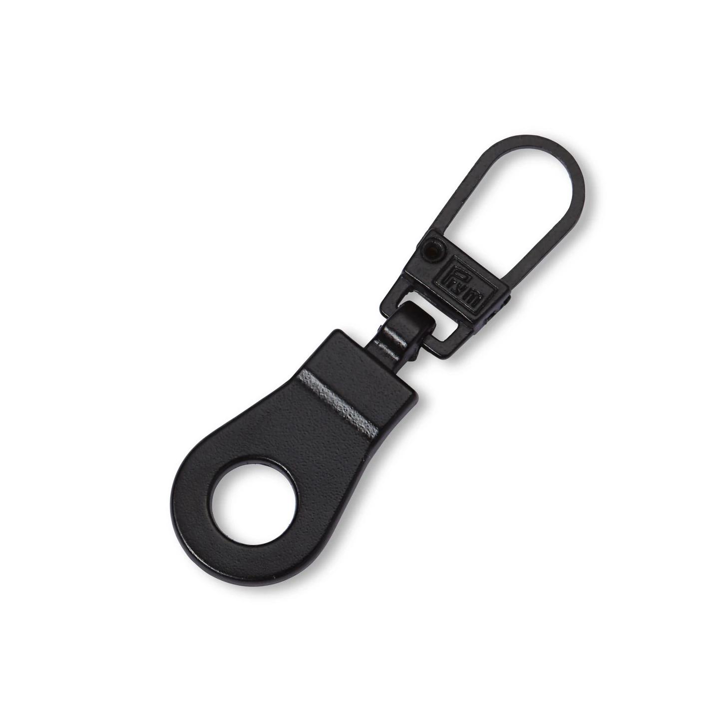Tirador para cursor de cremallera en metal de color negro con diseño clásico y práctico para su uso.