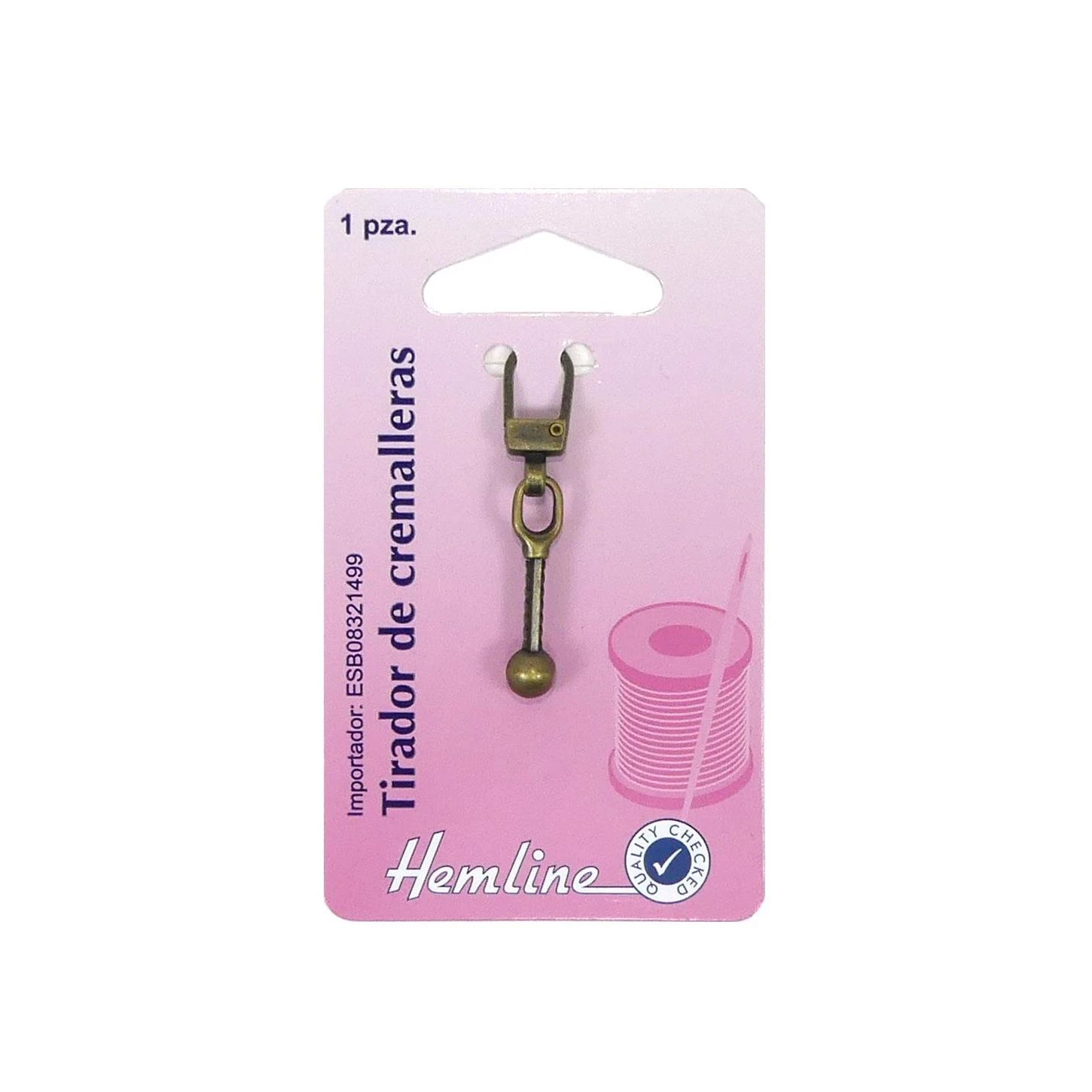 Tirador para cursor de cremallera en metal de color dorado viejo con diseño práctico para su uso y 4,5cm de longitud.