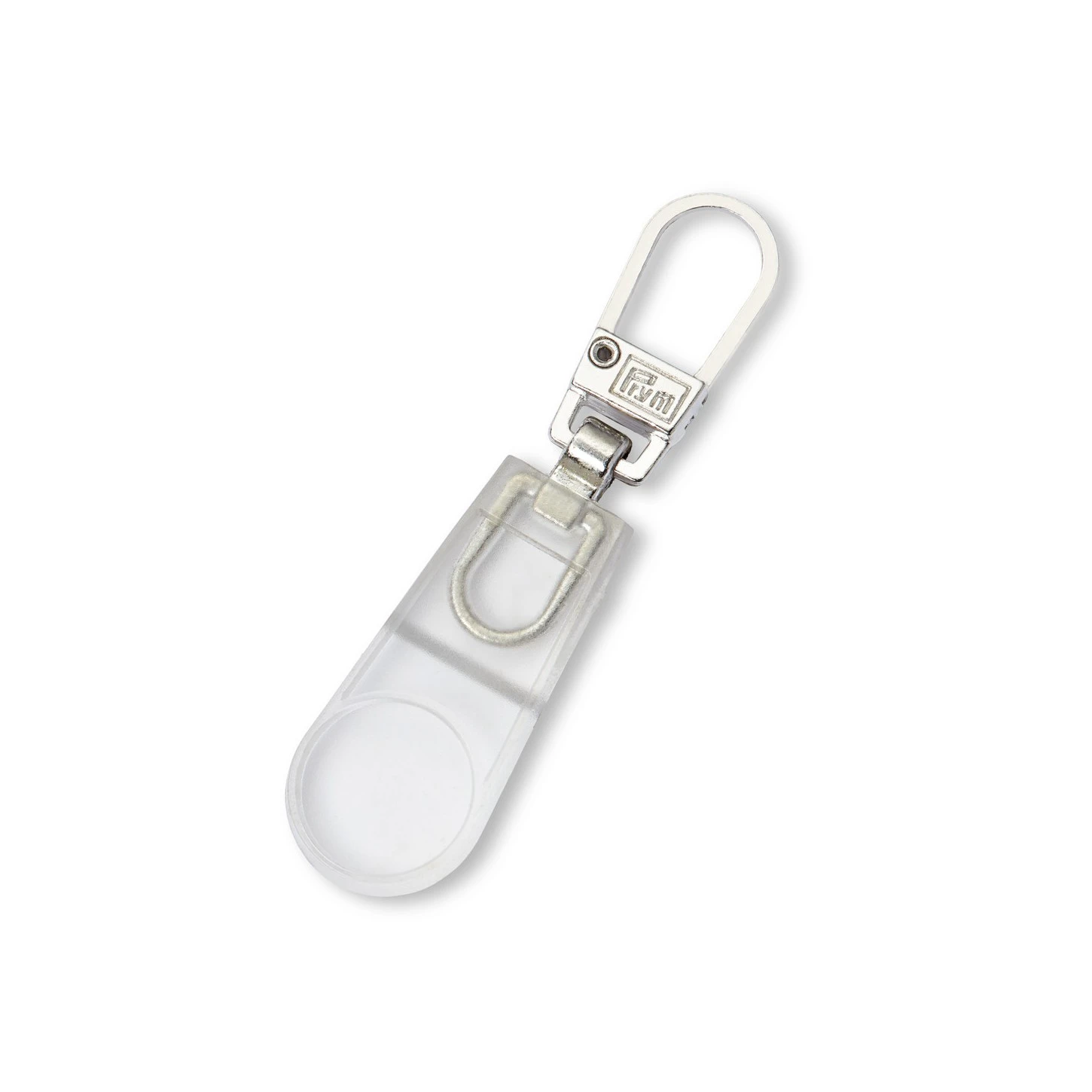 Tirador para cursor de cremallera en metal con pieza plástica transparente aportando un diseño sport y práctico para su uso.