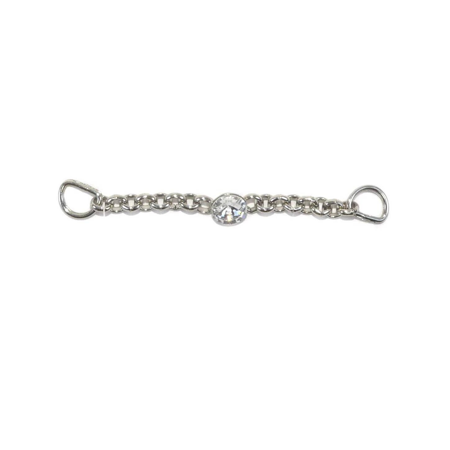 Trabilla metalizada en plata, con forma de cadena y una pieza de cristal blanco central. De 6,5cm de largo.