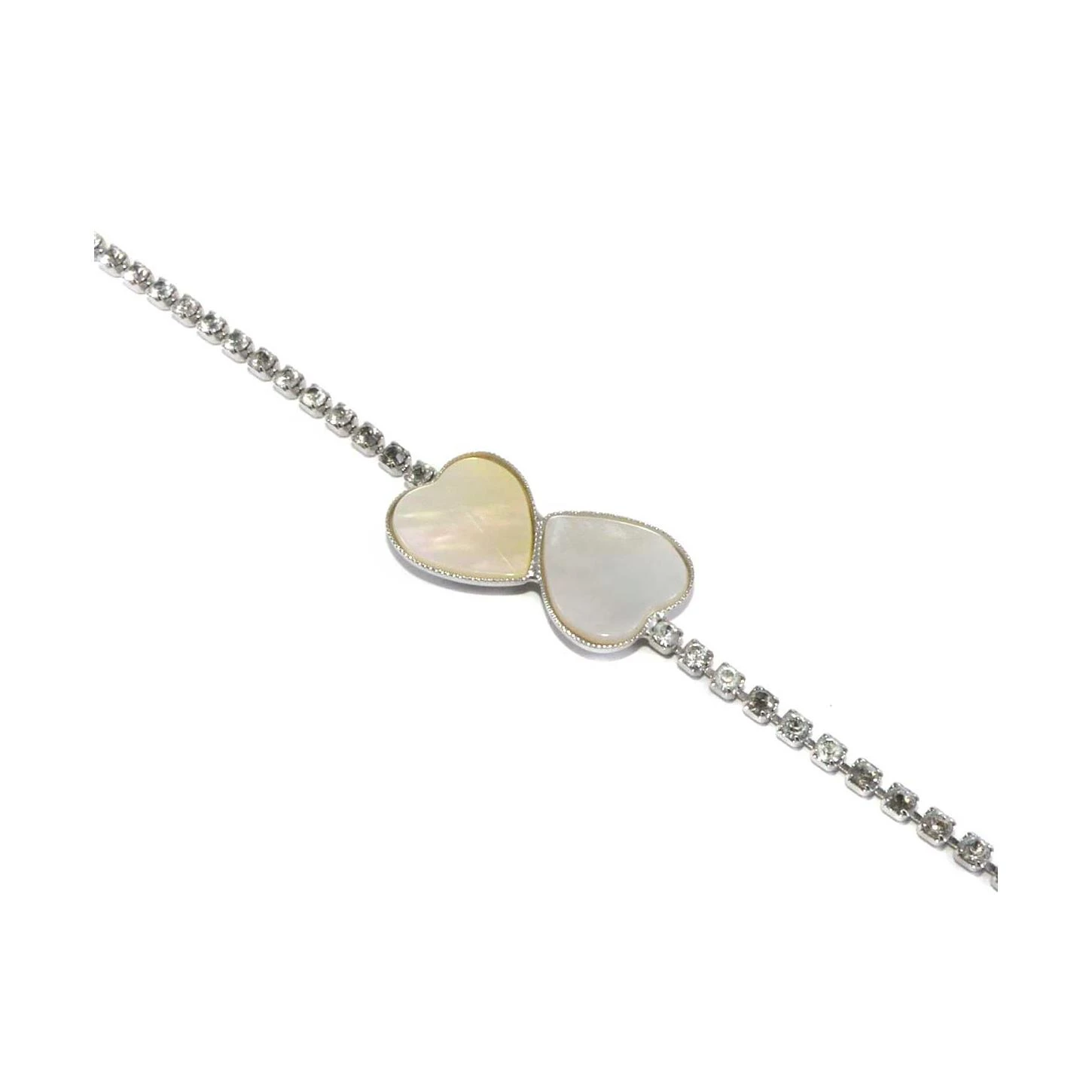 Trabilla original metalizada en plata, formada por una cadena de strass engarzado y dos corazones de nácar al centro. De 18cm de largo.
