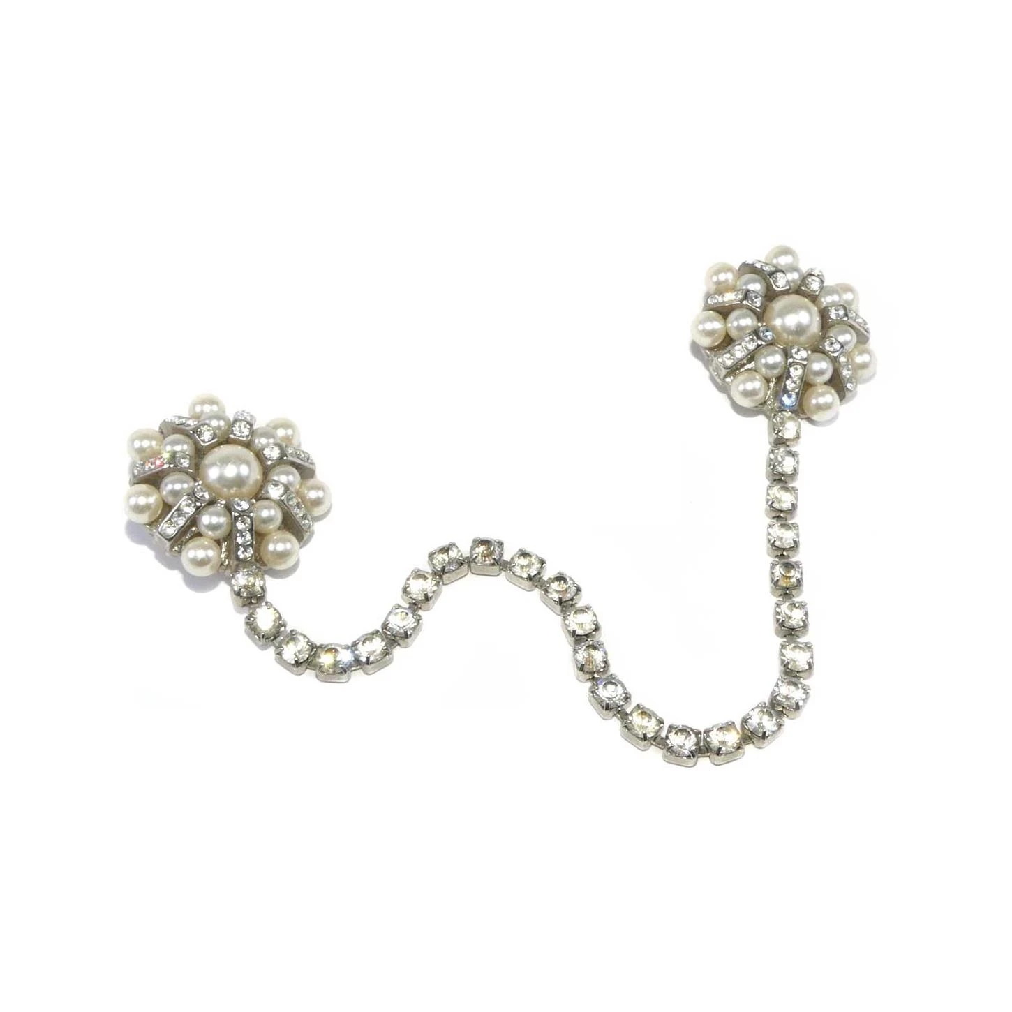 Original trabilla metalizada con cadena de piezas de strass y rosetones de perlas en crudo engarzadas. De 20cm de largo y 2,8cm de diámetro.