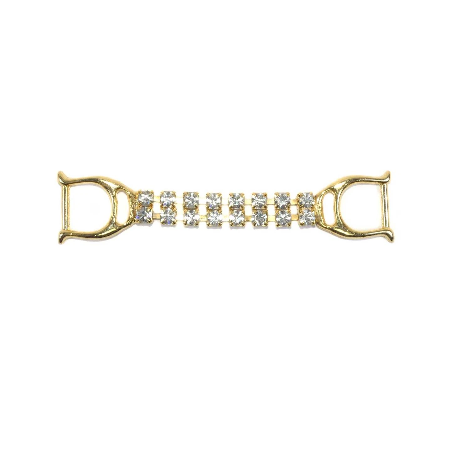 Trabilla original metalizada en dorado, con extremos en forma de estribos y cadena de pequeñas piezas de strass engarzadas. De 9cm de largo y 1,5cm de alto.