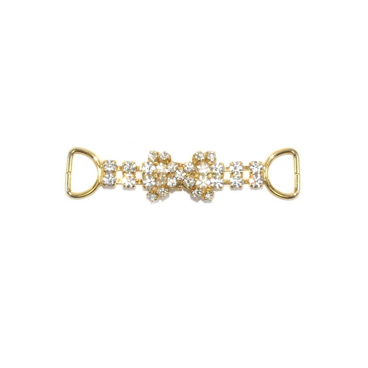 Trabilla original metalizada en dorado, con forma de lazo y pequeñas piezas de strass engarzadas en su interior. De 5,5cm de largo y 1cm de alto.