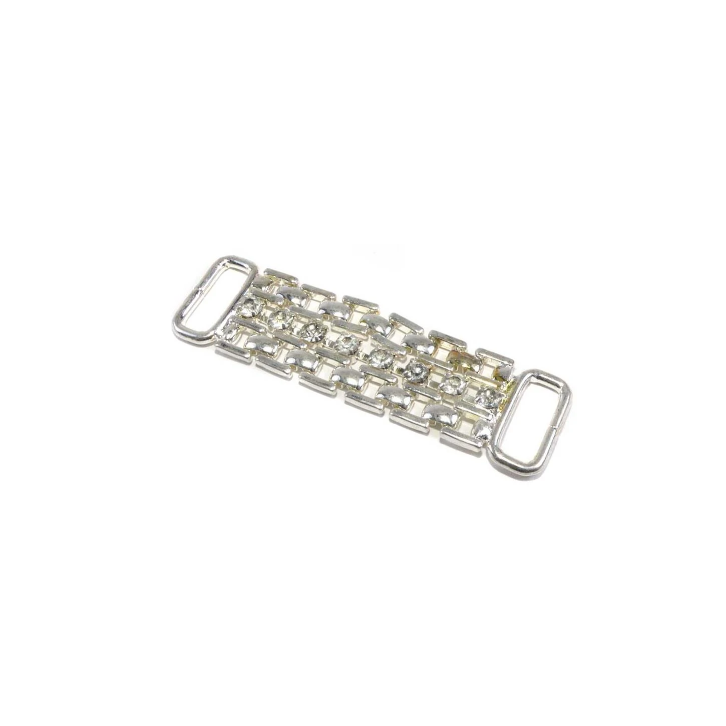 Original trabilla metalizada en plata, conformada por cadenas y pequeñas piezas de strass en su interior. De 6,5cm de largo.