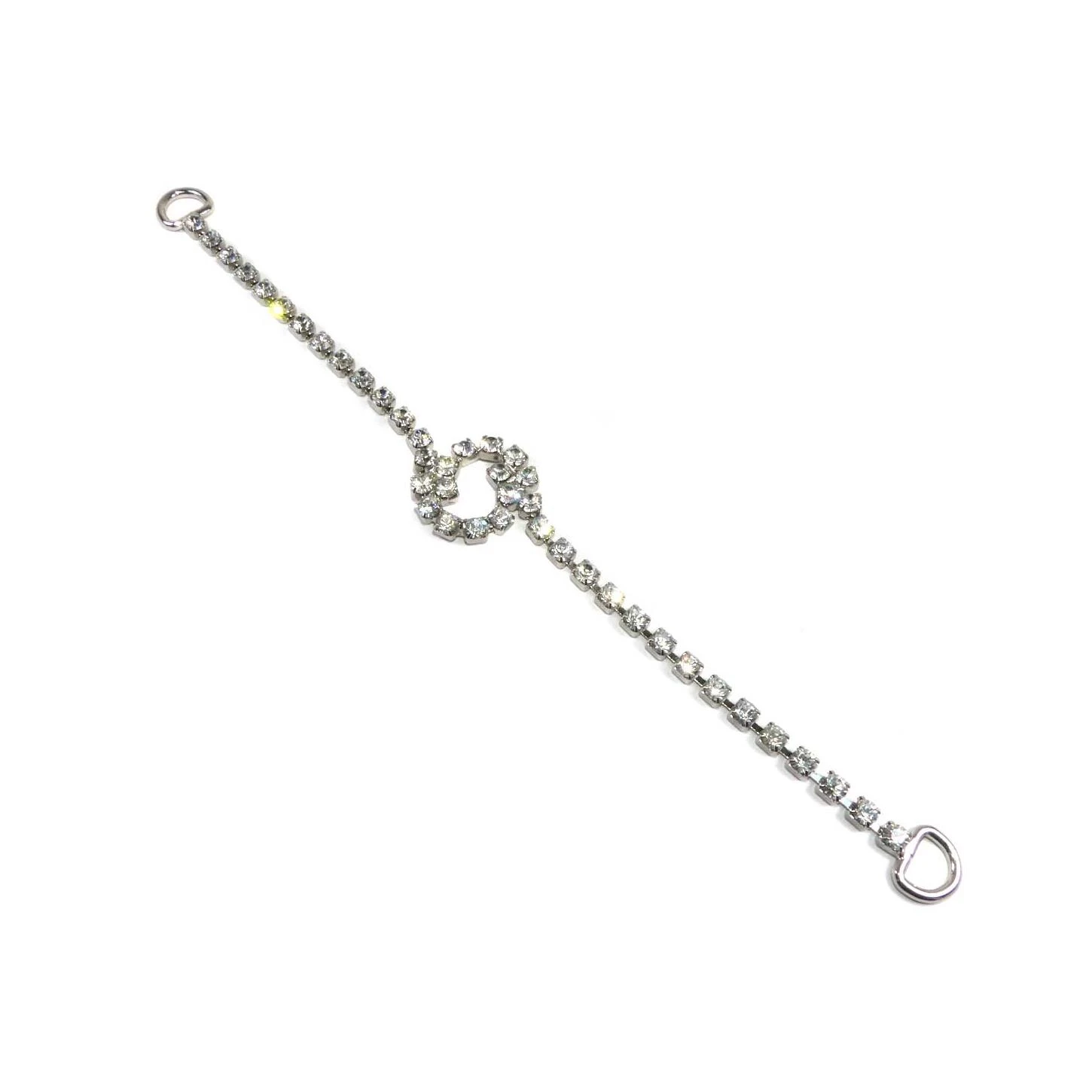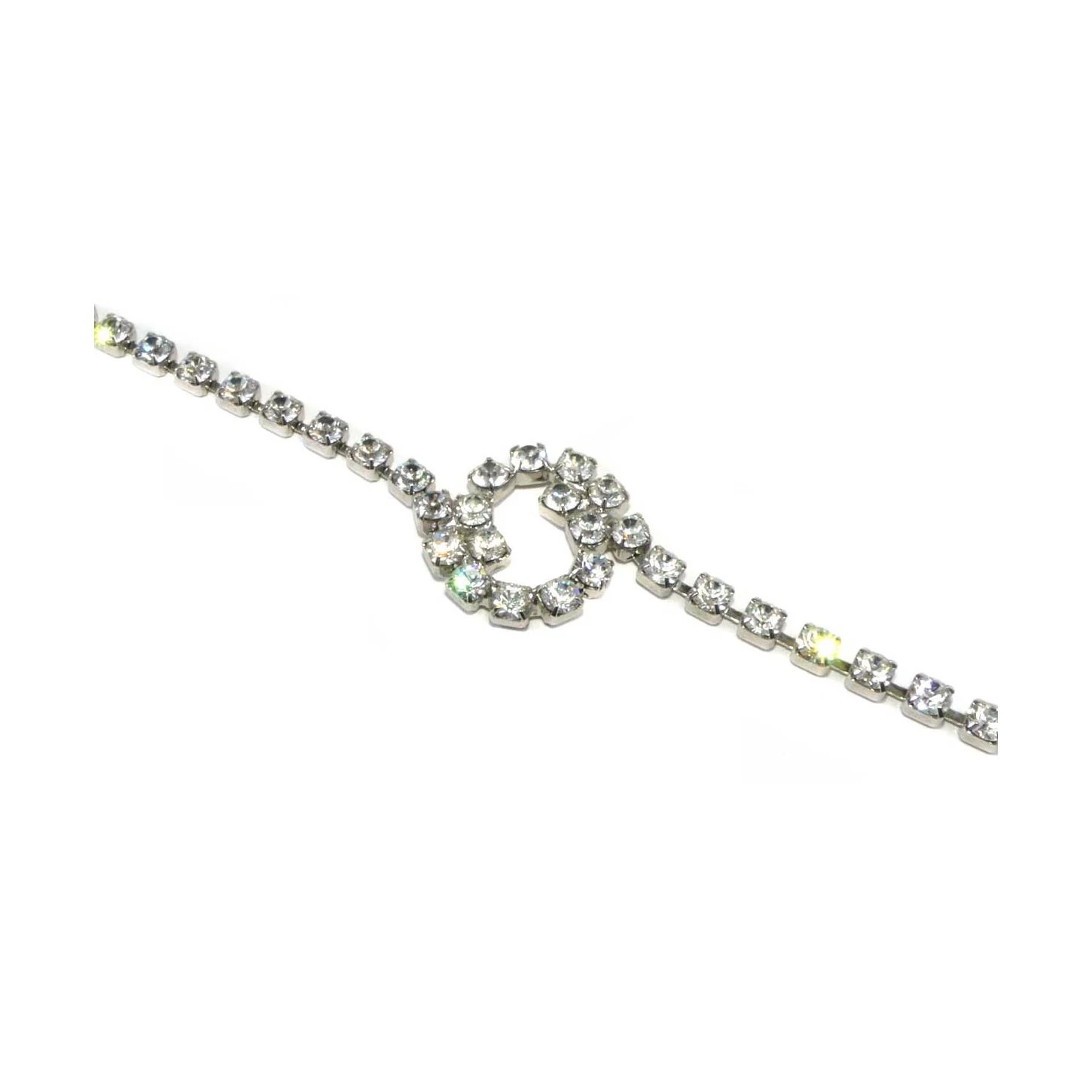 Preciosa trabilla metalizada en plata, compuesta por una cadena de pequeñas piezas de strass engarzadas y una espiral en su centro. De 20cm de largo.