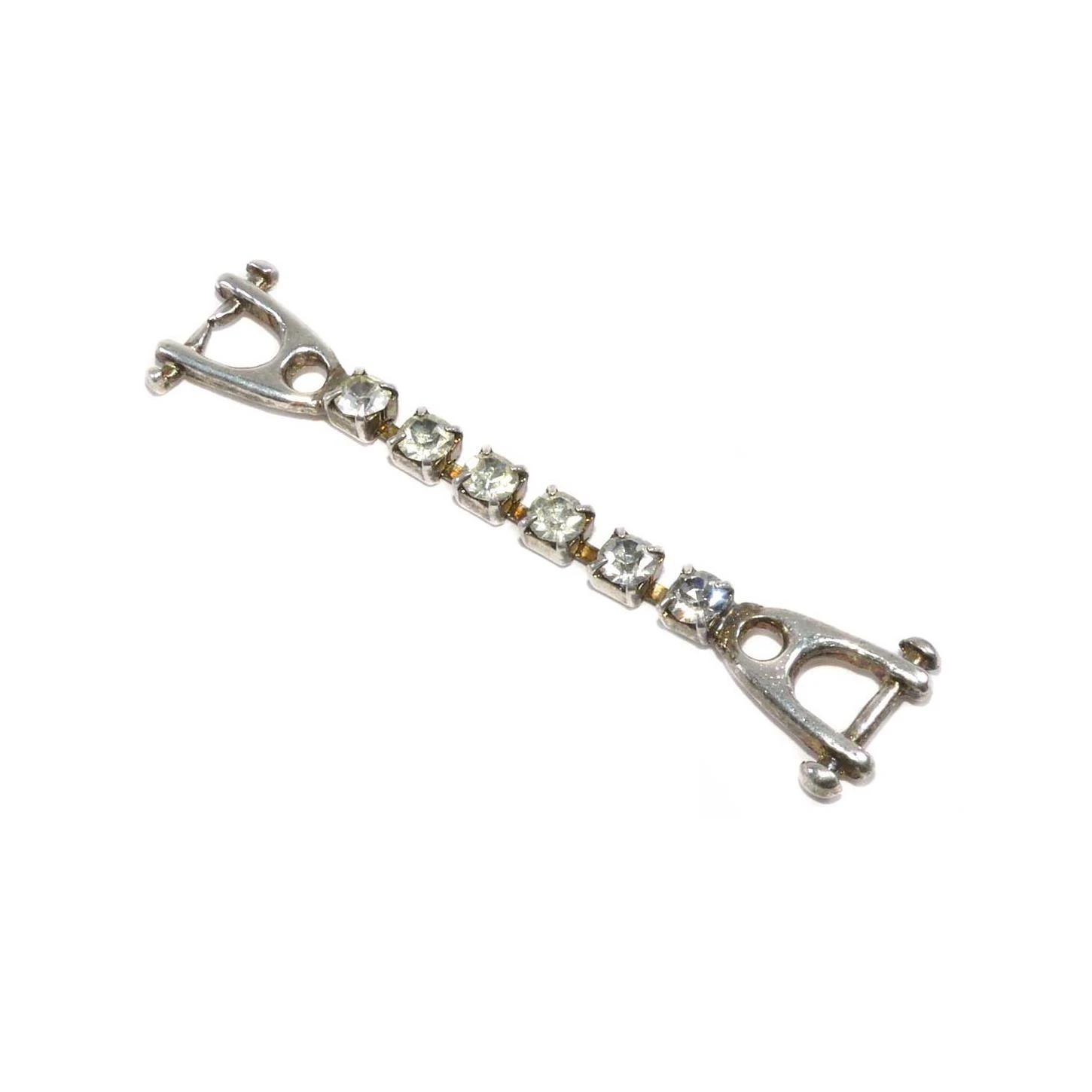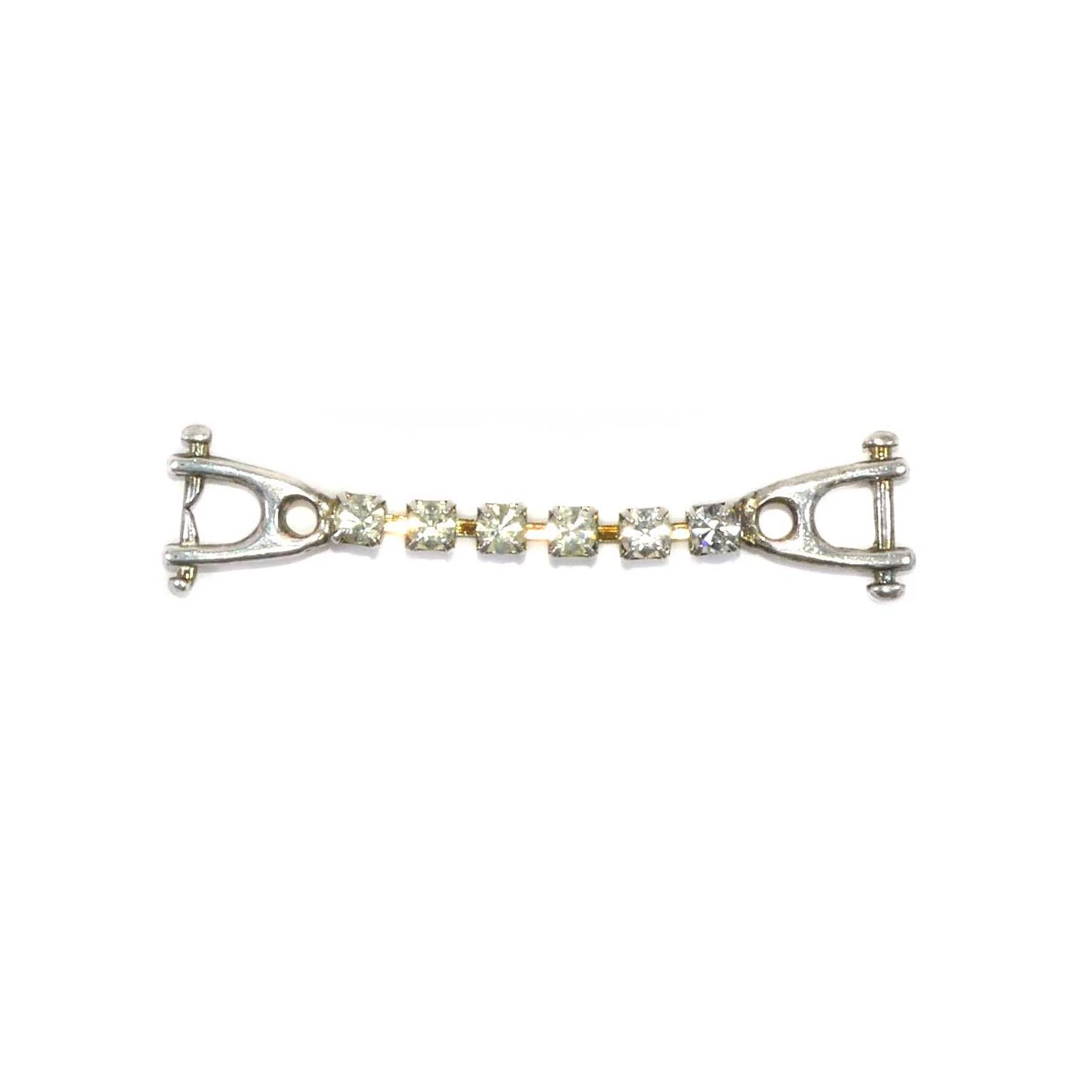 Trabilla original metalizada en plata, con extremos en forma de estribos y cadena de pequeñas piezas de strass engarzadas. De 6,5cm de largo y 1cm de alto.