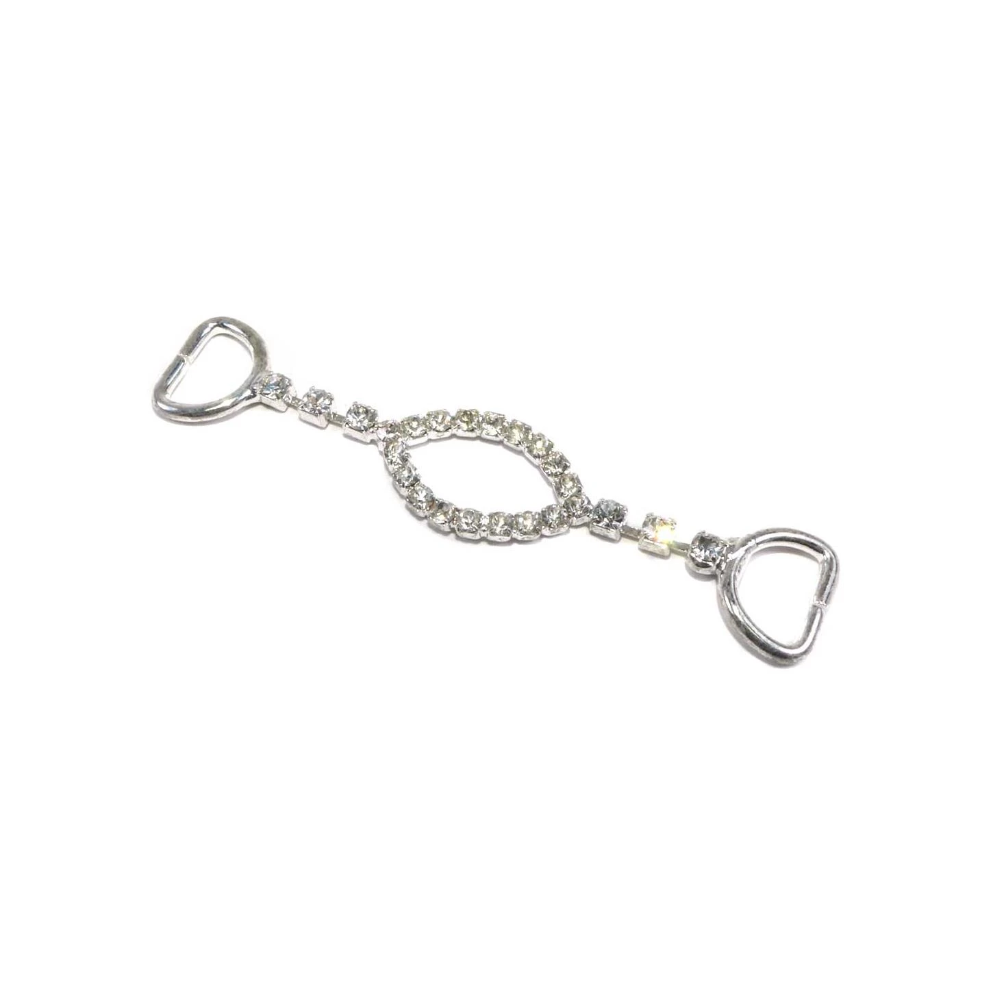 Trabilla original metalizada en plata, con forma de óvalo y pequeñas piezas de strass engarzadas en su diseño. De 7cm de largo.